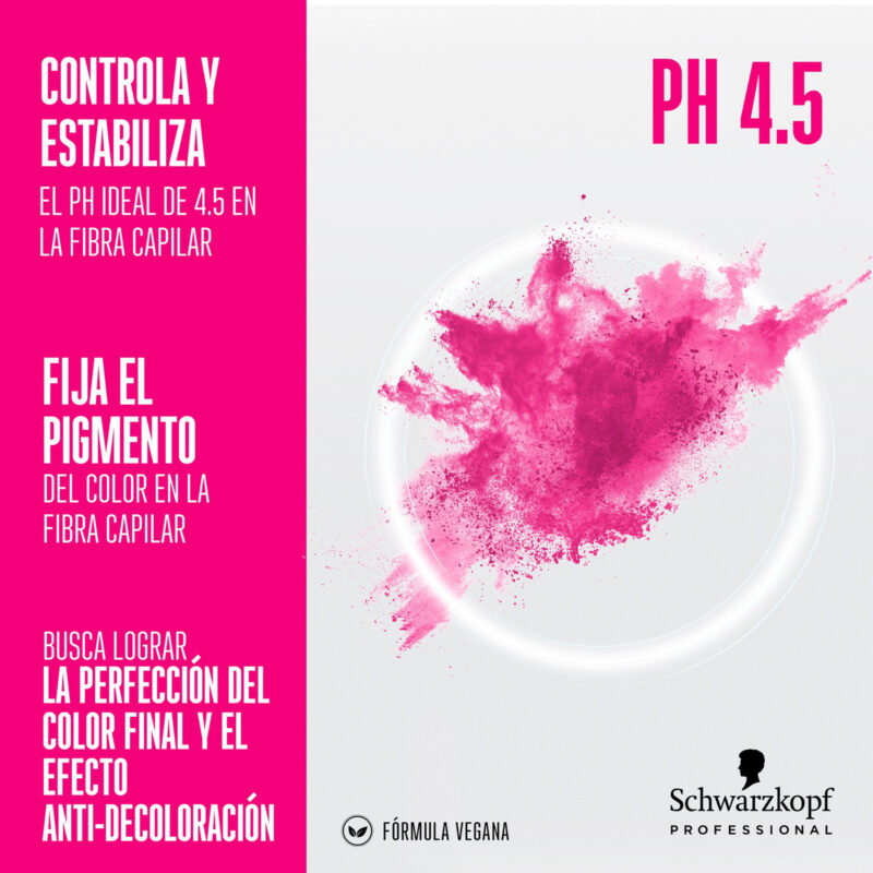 Trabajando con ácido láctico e hidróxido de calcio, tensa y estabiliza la matriz en su pH óptimo de 4.5 para congelar profundamente los pigmentos de color dentro de la matriz del cabello para lograr la máxima perfección del color y un efecto anti-decoloración.