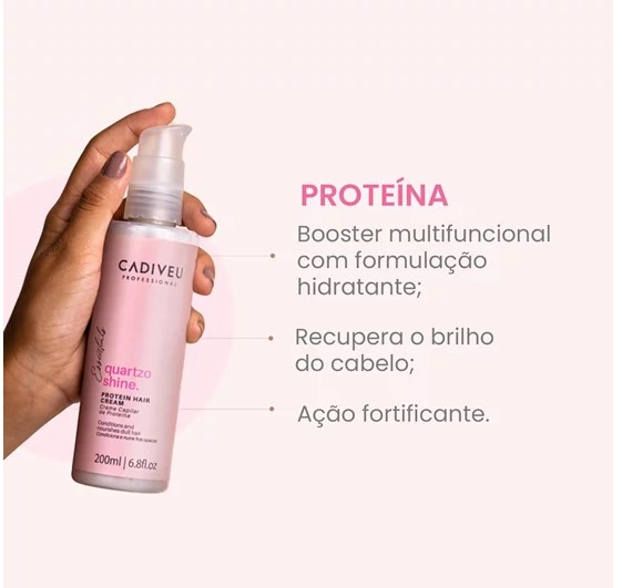 Crema Proteína Quartzo Shine Cadiveu es un potenciador multifuncional diseñado para reparar, nutrir y fortalecer el cabello, aportando un brillo intenso y un aspecto saludable. Su innovadora fórmula, enriquecida con proteínas, aceites vegetales y cuarzo rosa, deja el cabello más suave, sedoso y protegido contra la humedad.
