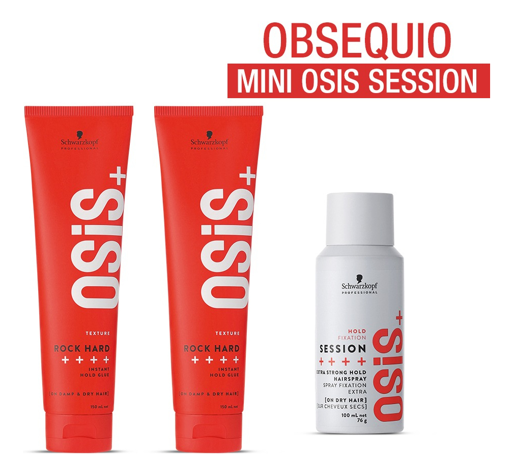 Osis Gel Rock Hard Schwarzkopf X2 es un pack de dos geles de fijación extra fuerte de 150 ml cada uno, diseñados para lograr estilos radicales, estructurados y de larga duración con un acabado brillante y sin residuos. Como regalo especial, este combo incluye una laca Osis Session Spray 100 ml de fijación fuerte en formato portátil, ideal para retocar tu peinado donde estés y sellar tu estilo con máxima durabilidad.