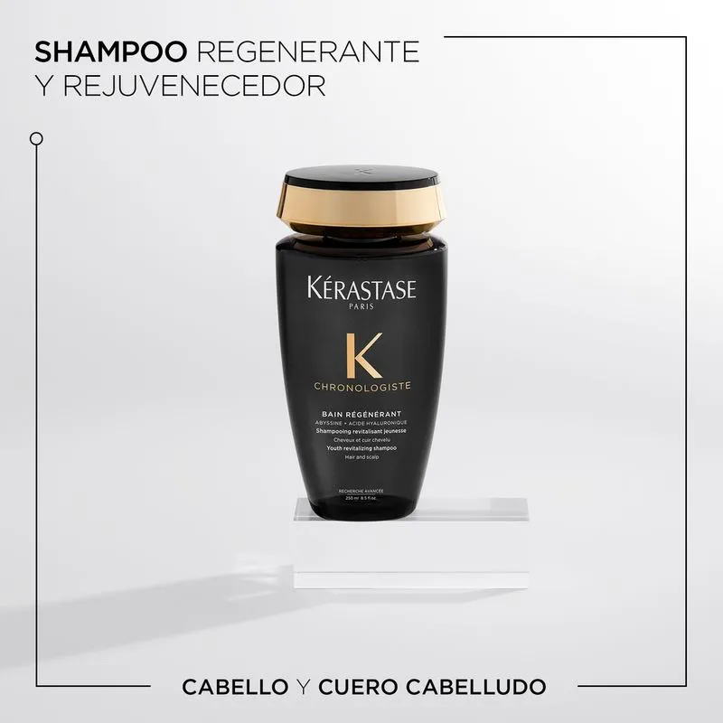 Shampoo Bain Chronologiste Kerastases un shampoo regenerador antiedad de lujo, diseñado para combatir los signos visibles del envejecimiento tanto en el cabello como en el cuero cabelludo. Con una fórmula avanzada enriquecida con ácido hialurónico, este shampoo limpia suavemente las impurezas mientras fortalece, hidrata y restaura el brillo y la vitalidad perdidos con el tiempo.