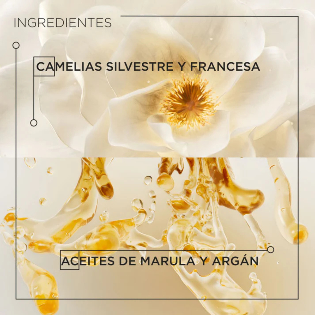 Aceite de Camelia: Con alto contenido de vitamina E y Omega 9, este aceite suaviza la fibra capilar, mejora la elasticidad y protege contra la sequedad y el frizz.