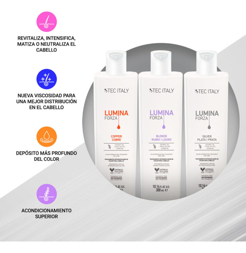 Los matizadores de TEC ITALY en la línea Lumina Forza ayudan a neutralizar o corregir tonos no deseados después de la coloración, para que tu color siempre luzca perfecto. Disponibles en Silver, Rosa, Blonde, Violet y Azul para adaptar el tratamiento a tus necesidades específicas.